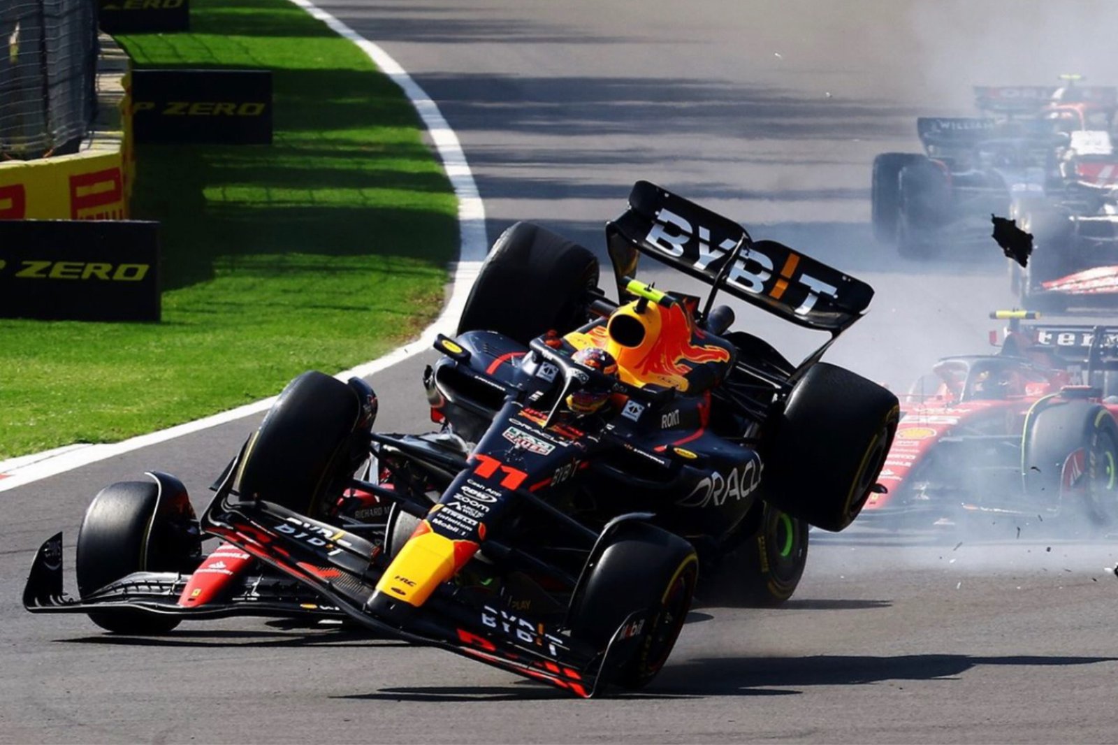 Sergio buscaba adelantarse a Charles, ya que él tenía la pole position, pero justo en la primera curva hicieron contacto. A pesar de esto, el de Ferrari logró seguir en la competencia. El tapatío se vio irritado, decepcionado y triste después de ser llamado a los boxes por su escudería.