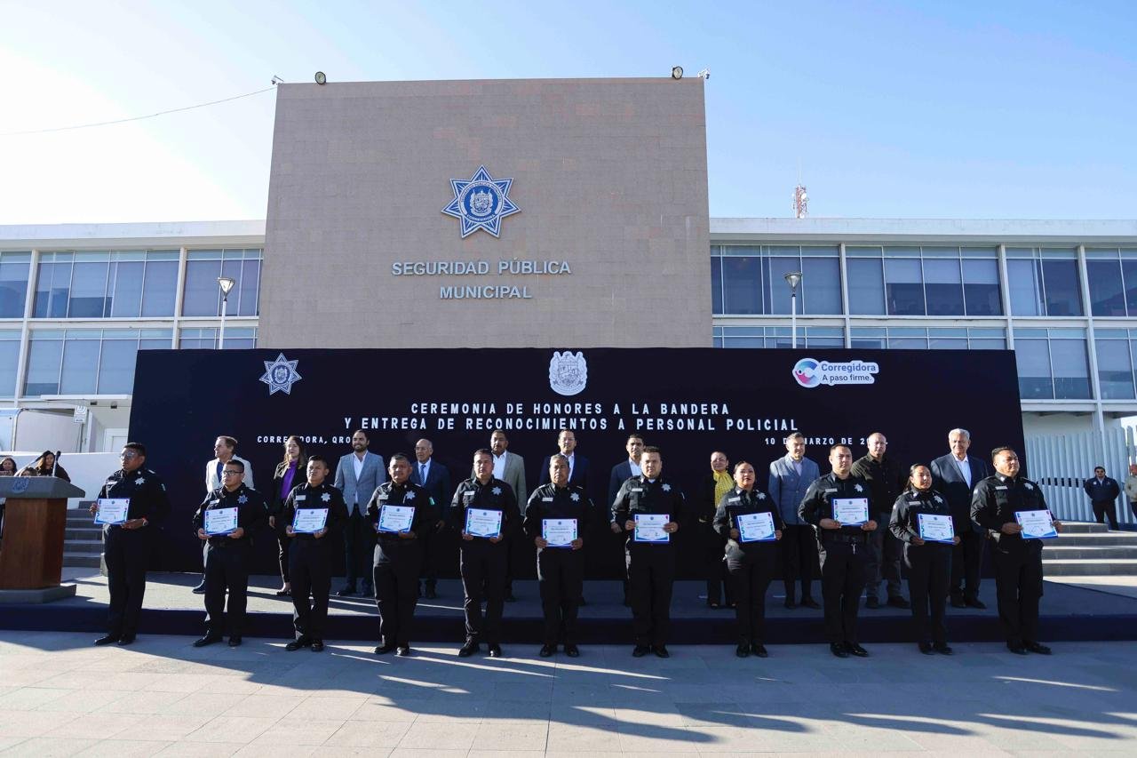 El presidente municipal de Corregidora, Chepe Guerrero, encabezó los honores a la bandera en las instalaciones de la Secretaría de Seguridad Pública Municipal. Además, entregó 52 reconocimientos a policías, tres monitoristas y una operadora de la línea de emergencia 911 por su destacada eficiencia en el ejercicio de sus funciones.