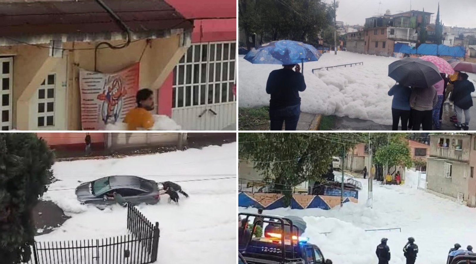 La colonia Nueva San Rafael se vio invadida por las aguas contaminadas y la densa espuma tóxica que cubrió las calles y se filtró en las casas. Al notar la gravedad del incidente, los vecinos se unieron a los equipos de emergencia para intentar frenar el avance de las aguas negras y evitar que siguieran afectando sus hogares.