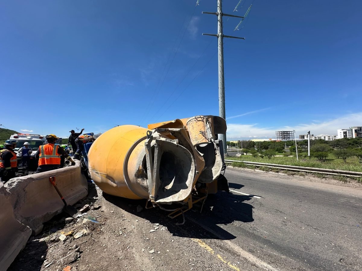 Este jueves una mezcladora de concreto volcó a la altura de Juriquilla. Elementos de emergencia realizaron maniobras para rescatar al conductor, quien quedó atrapado en la cabina y fue trasladado a un hospital. La zona fue acordonada por personal de Protección Civil del estado y del municipio, Bomberos Querétaro, POES y paramédicos del CRUM.